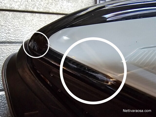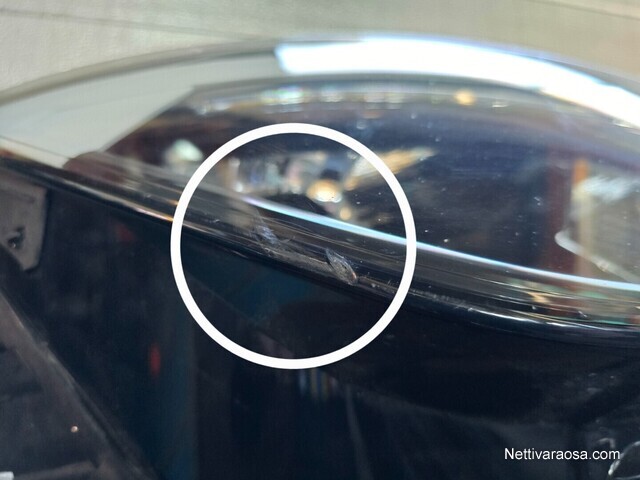 Lasissa tyypillisiä kiveniskemiä sekä syvemmät jäljet lokasuojan puolen reunassa. Ei kuitenkaan halki. Katso kuvat!