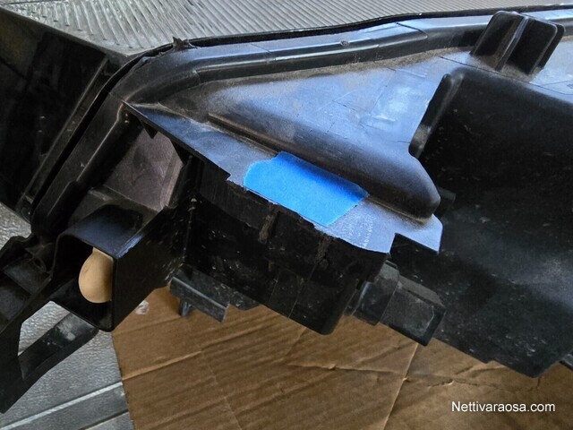 Ohjainboksit umpion takaa myyty. Yksi kiinnityskorva poikki, merkattu 4. kuvassa sinisellä teipillä. Alkuperäinen korvan korjaussarja saatavilla Volkswagenilta, varaosanumero 11A941226.