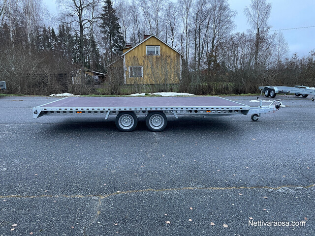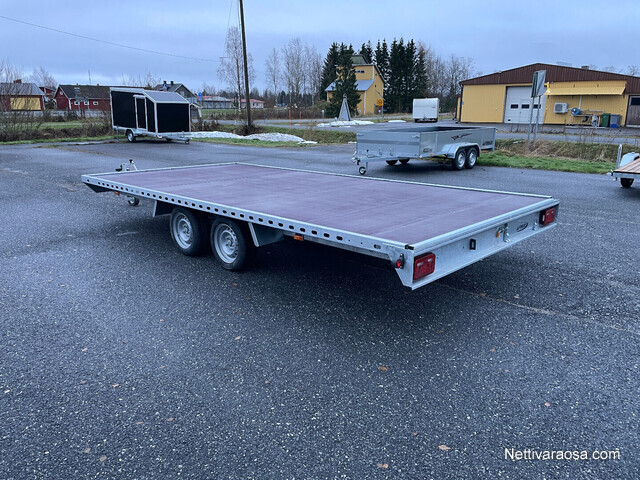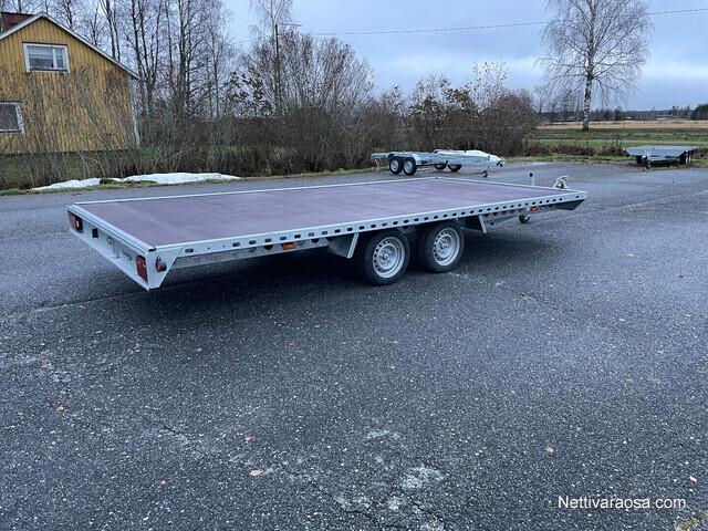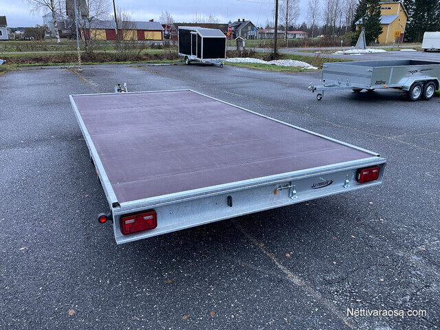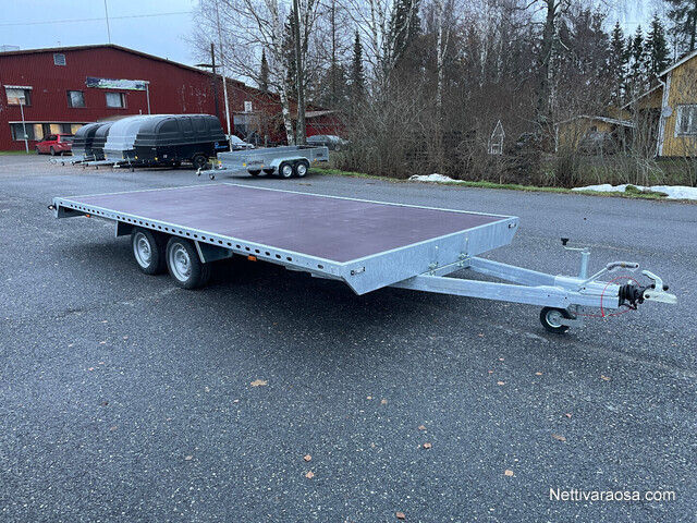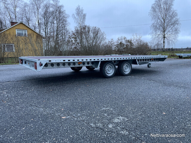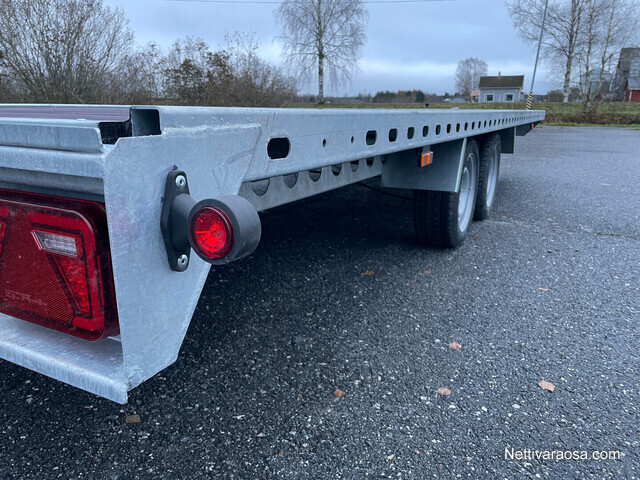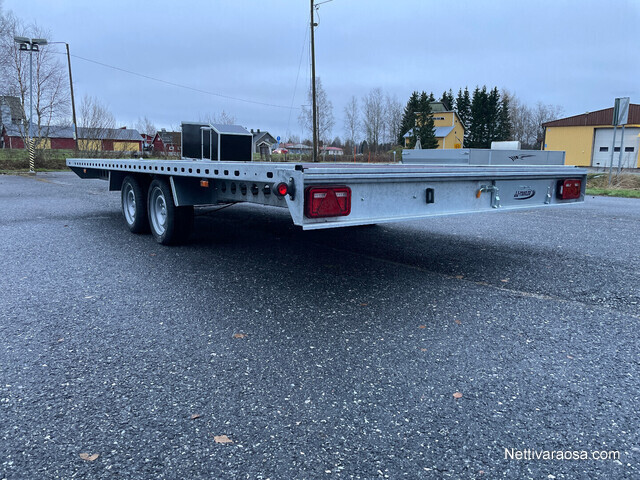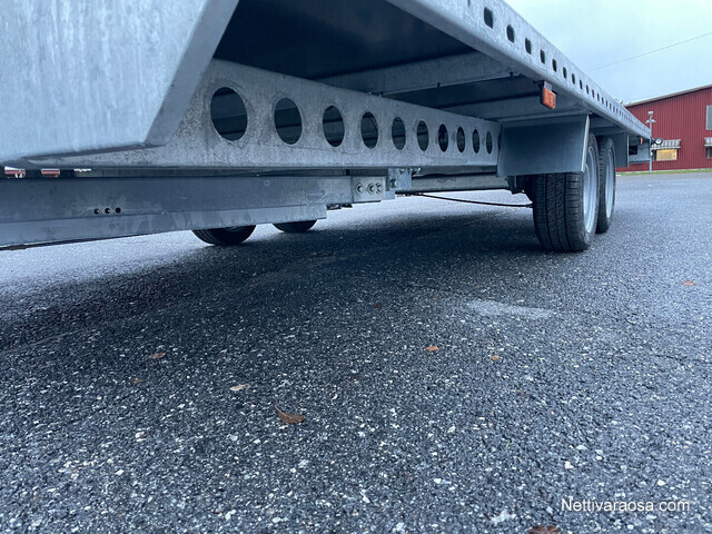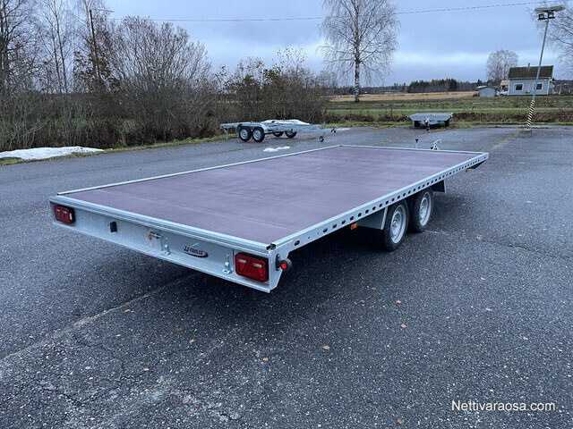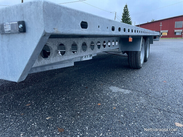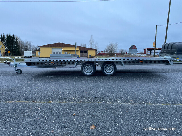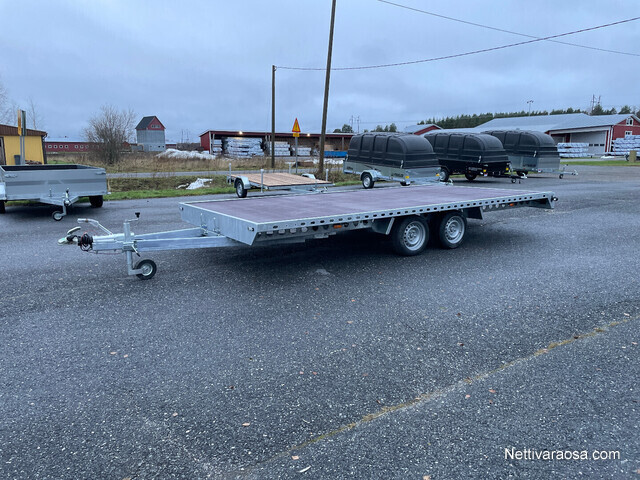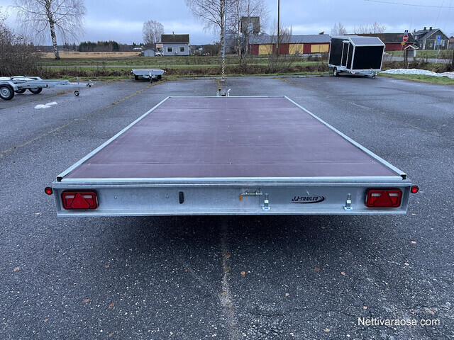 JJ-Trailer 5500FB-27 on lavetti / Autotrailer. Lavakoko on tässä isommassa 2500x5500, kokonaispaino 2700kg ja kantavuus 1950kg. Kaikissa 2700kg kärryissä on kippi vakiona.