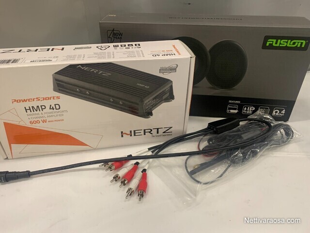 paketissa :vahvistin, mustat kaiuttimet, antenni, kaapelit